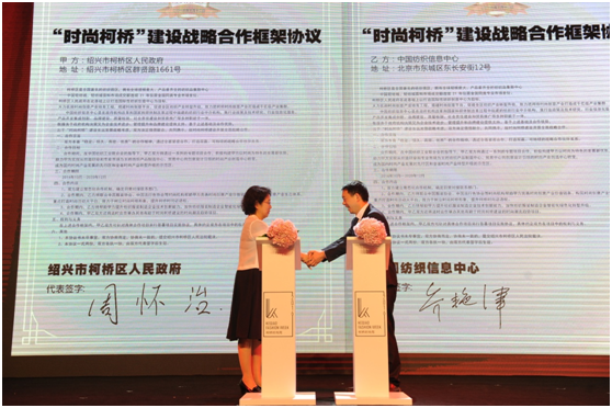 发布会上,中国纺织信息中心、国家纺织产品开发中心与绍兴市柯桥区人民政府共同签署了 “时尚柯桥建设战略合作框架协议”。中国纺织信息中心主任乔艳津、绍兴市柯桥区人民政府副区长周怀治作为双方代表在会上签署协议。