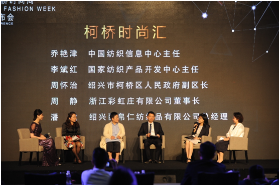在“柯桥时尚汇”环节,中国纺织信息中心主任乔艳津、国家纺织产品开发中心主任李斌红、绍兴市柯桥区人民政府副区长周怀治,以及作为柯桥企业代表的上海莹寇服饰有限公司、浙江彩虹庄有限公司董事长周静,绍兴皕帛仁纺织品有限公司总经理潘敏从不同层面和角度对此次双方的战略合作、时尚周的定位以及柯桥时尚产业的创新实践展开了深入的探讨。