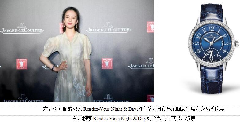 李梦佩戴积家 Rendez-Vous Night & Day约会系列日夜显示腕表出席积家慈善晚宴。时计搭载着来自午夜最神秘的蓝色表盘,表圈镶嵌的钻石宛若夜空中最璀璨的繁星,赋予此腕表神秘、美妙、宁静而不失高贵的独特魅力。