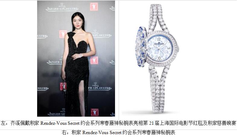 齐溪佩戴积家Rendez-Vous Secret约会系列常春藤神秘腕表亮相第21届上海国际电影节红毯及积家慈善晚宴。波光闪耀的珍珠母贝表盘上,常春藤图案栩栩如生,时间在Rendez-Vous约会系列12个标志性的数字间缓缓流淌,镶嵌蓝色宝石的表盖犹如雪花般绽放着迷人风采。