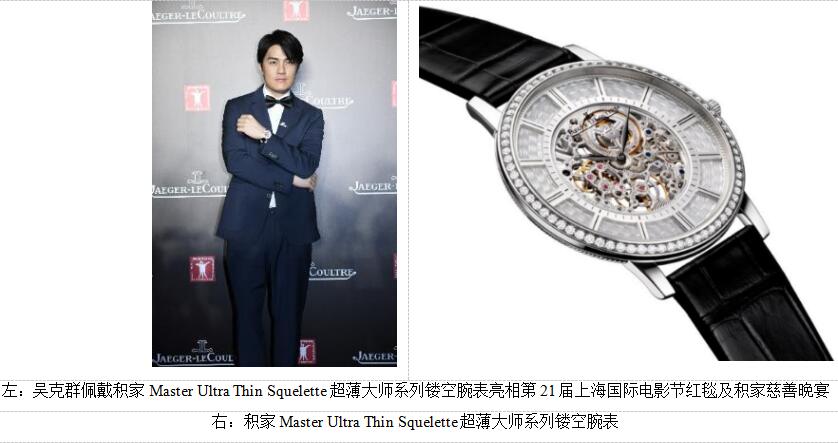 吴克群佩戴积家Master Ultra Thin Squelette超薄大师系列镂空腕表亮相第21届上海国际电影节红毯及积家慈善晚宴。时计搭载着精细雕琢的镂空机芯,百转千回的曼妙曲线和若隐若现的机械结构,以及自成风景的烤蓝螺丝组成一幅气势恢宏的工艺大作。为个性时代拥有高标准的男士提供一个拥有精致格调的腕间世界。
