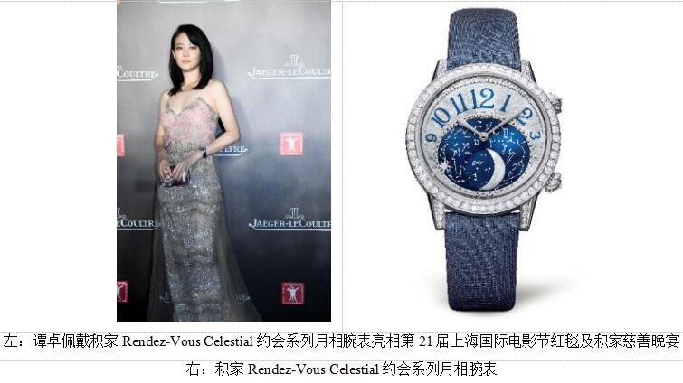 谭卓佩戴积家Rendez-Vous Celestial约会系列月相腕表亮相第21届上海国际电影节红毯及积家慈善晚宴。皎月在蔚蓝的星空中显得格外的明亮,流星划过夜空,却从未打破这份宁静,为这谧静的天空增添几分神秘色彩。盘缘镶嵌的钻石宛如璀璨的群星,形成众星拱月的视觉盛宴,散发着女性迷人优雅的气息。